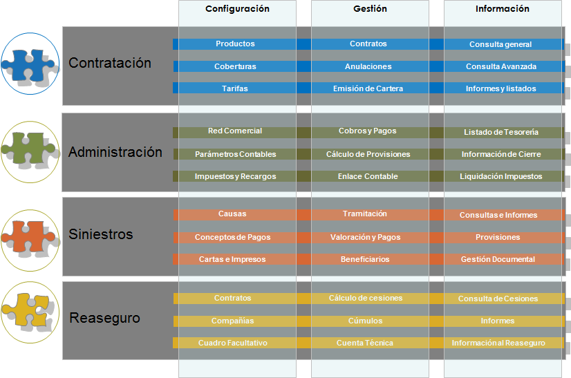 - Riesgo. Engloba los procedimientos, estructuras, métodos de cálculo y datos que dan soporte a los productos de riesgo, de acuerdo con la particularidad y métodos de cada compañía y de cada producto. Es flexible y ampliable para dar cabida a cualquier tipo de modalidad de riesgo que se necesite comercializar. Admite flexibilidad en garantías, formas de tarifación, formas de pago, reaseguro (cuota parte, excedente, facultativo), gestiona de forma eficaz el circuito de solicitudes y reconocimientos médicos.